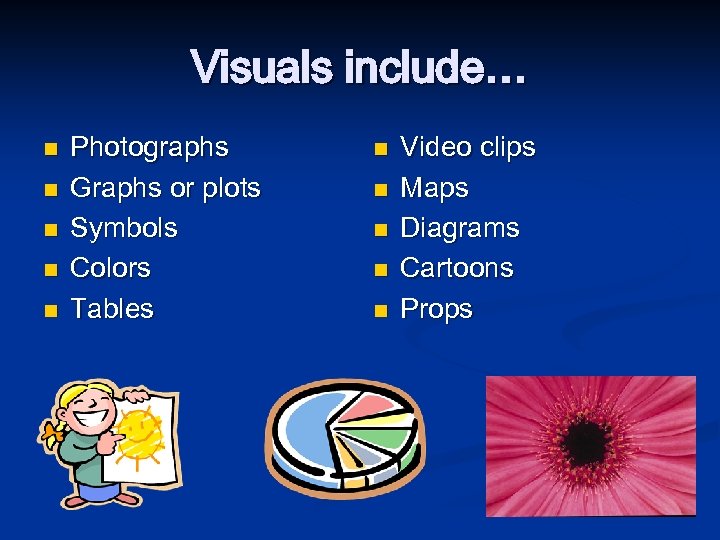 Visuals include… n n n Photographs Graphs or plots Symbols Colors Tables n n n Video clips Maps Diagrams Cartoons Props