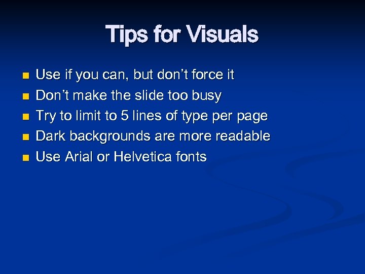 Tips for Visuals n n n Use if you can, but don’t force it Don’t make the slide too busy Try to limit to 5 lines of type per page Dark backgrounds are more readable Use Arial or Helvetica fonts