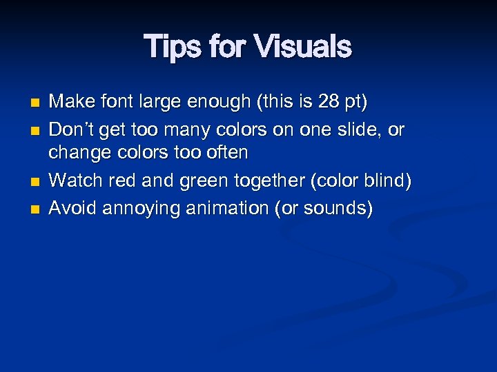 Tips for Visuals n n Make font large enough (this is 28 pt) Don’t get too many colors on one slide, or change colors too often Watch red and green together (color blind) Avoid annoying animation (or sounds)