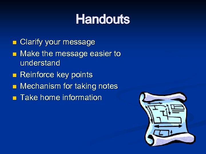 Handouts n n n Clarify your message Make the message easier to understand Reinforce key points Mechanism for taking notes Take home information
