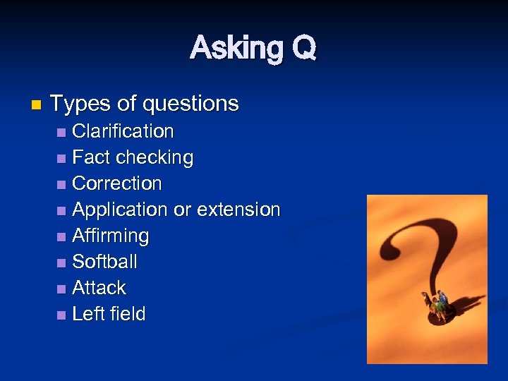Asking Q n Types of questions Clarification n Fact checking n Correction n Application or extension n Affirming n Softball n Attack n Left field n