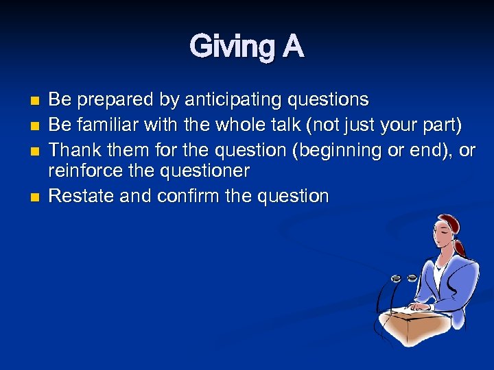 Giving A n n Be prepared by anticipating questions Be familiar with the whole talk (not just your part) Thank them for the question (beginning or end), or reinforce the questioner Restate and confirm the question