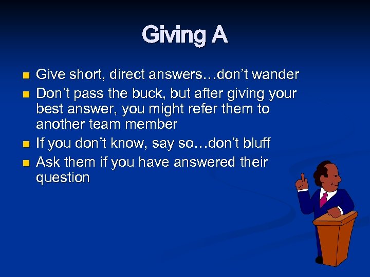 Giving A n n Give short, direct answers…don’t wander Don’t pass the buck, but after giving your best answer, you might refer them to another team member If you don’t know, say so…don’t bluff Ask them if you have answered their question