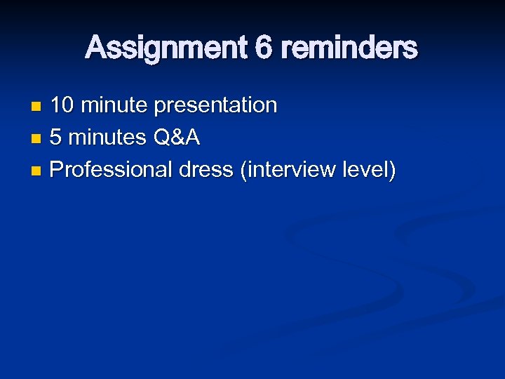 Assignment 6 reminders 10 minute presentation n 5 minutes Q&A n Professional dress (interview level) n
