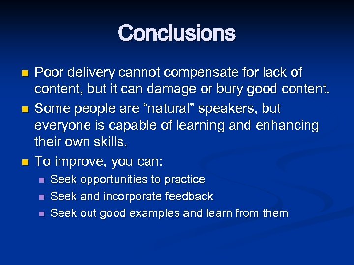 Conclusions n n n Poor delivery cannot compensate for lack of content, but it can damage or bury good content. Some people are “natural” speakers, but everyone is capable of learning and enhancing their own skills. To improve, you can: n n n Seek opportunities to practice Seek and incorporate feedback Seek out good examples and learn from them