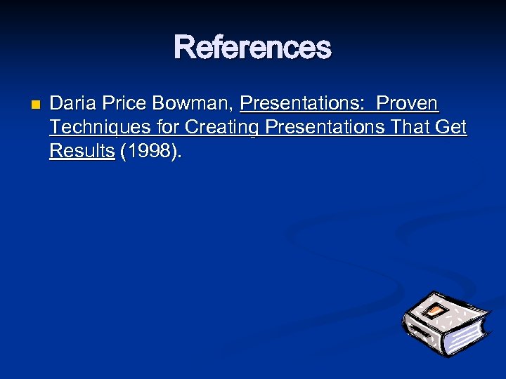References n Daria Price Bowman, Presentations: Proven Techniques for Creating Presentations That Get Results (1998).