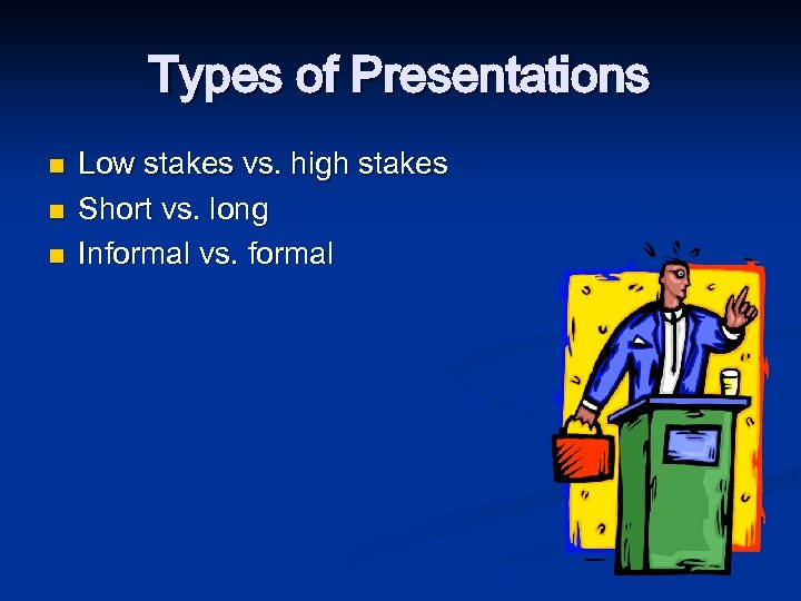 Types of Presentations n n n Low stakes vs. high stakes Short vs. long Informal vs. formal