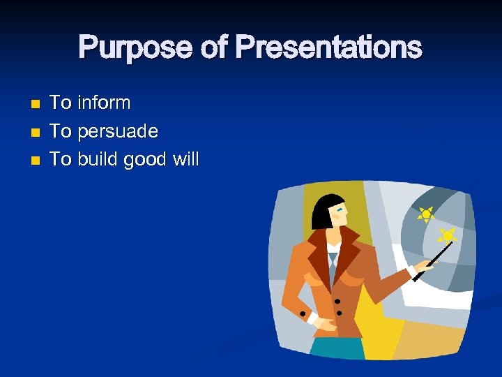 Purpose of Presentations n n n To inform To persuade To build good will