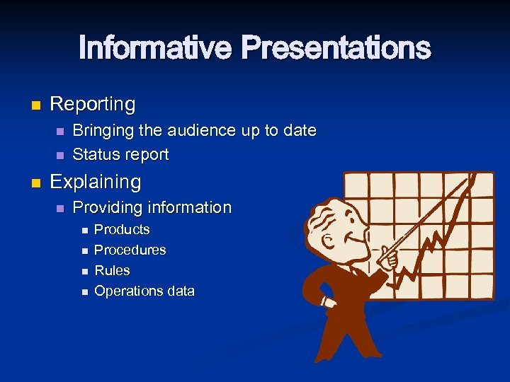 Informative Presentations n Reporting n n n Bringing the audience up to date Status report Explaining n Providing information n n Products Procedures Rules Operations data