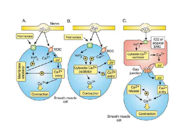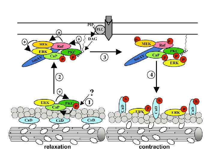 Расслабление ГМ Са и / или увеличение активности фосфотазы, инактивация киназы легких цепей миозина Сигнальные молекулы протеинкиназа С GEF (фактор обмена гуаниловых нуклеотидов) Rho-киназа ГДФ ГТФ Малая ГТФаза Rho Ингибиторы фосфотазы: таутомицин, окадаевая кислота, микроцистин-LR