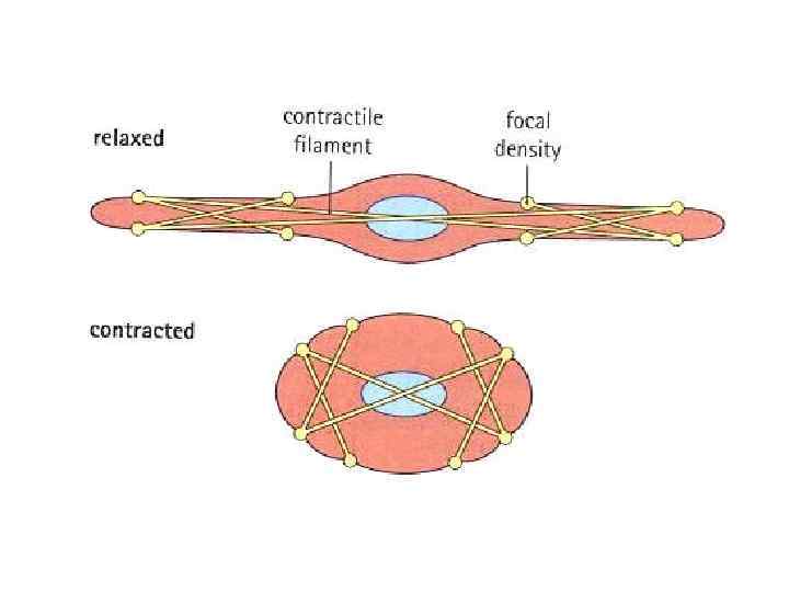толстые филаменты тонкие филаменты Плотные тельца α-актинин Промежуточные (десминовые) филаменты десмин + виментин в состоянии покоя нитей актина больше, чем миозина