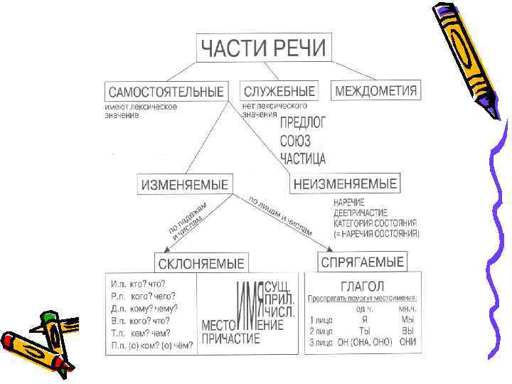 Причастие — указывает на признак предмета по действию, отвечает на вопросы какой? какая? какое? какие? (Прочитан, прочитаны). Имеет следующие морфологические признаки: состояние (активный / пассивный), вид, время, число, род, падеж. В предложении выступает определением или именной частью составного именного сказуемого.