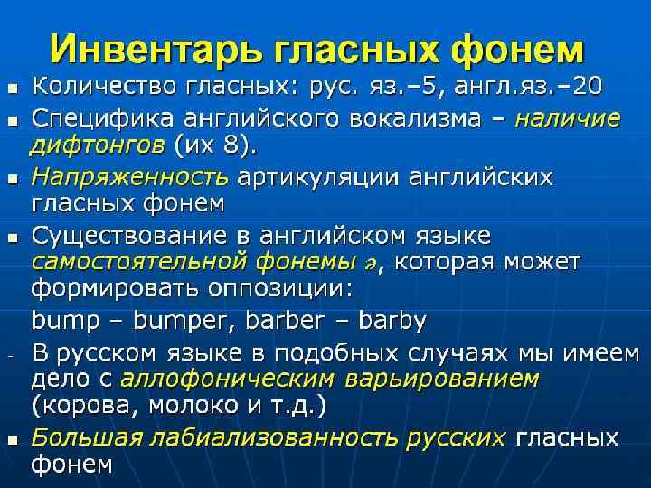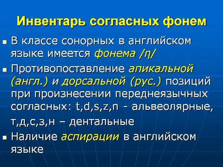 Фонологический анализ английских согласных фонем позволяет выделить 24 фонемы [p, b, t, d, k, g, f, v, θ, ð, s, z, ∫, з, h, t∫, ʤ, m, n, ŋ, w, r, l, j]. *