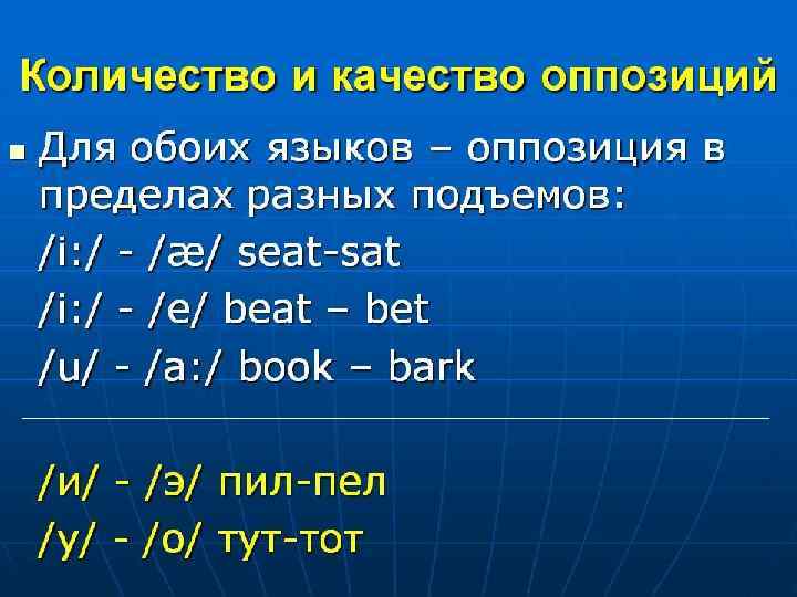 *по ряду: *переднего [i: , e, æ, i); * среднего [ з: , Ʌ, ə]. *заднего [ a: , o: , u: , υ, σ, ]. - по подъему: *высокого [i: , u: , i, υ]. *среднего [з: , e, Ʌ, ə]. *низкого [æ, a: , o: , σə].