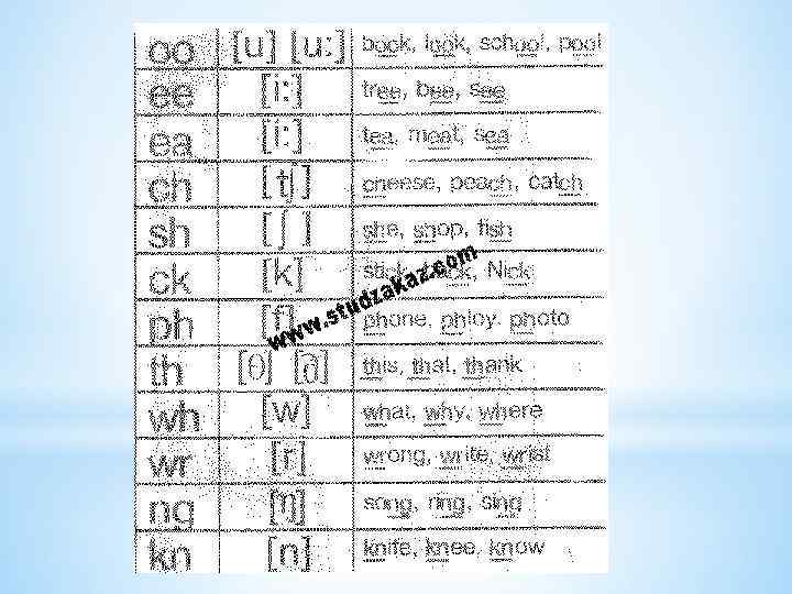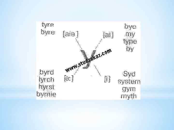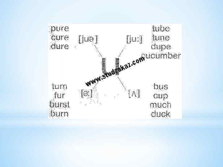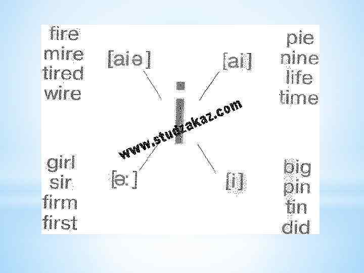 i: -i a: -Ʌ о: - σ u: -υ з: - ə e- æ ei, ai, oi, аυ, eυ, υə, iə. *