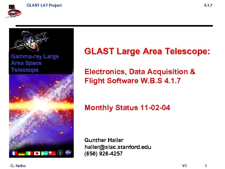 GLAST LAT Project Gamma-ray Large Area Space Telescope 4. 1. 7 GLAST Large Area Telescope: Electronics, Data Acquisition & Flight Software W. B. S 4. 1. 7 Monthly Status 11 -02 -04 Gunther Haller haller@slac. stanford. edu (650) 926 -4257 G. Haller V 3 1