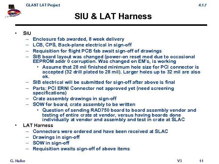 GLAST LAT Project 4. 1. 7 SIU & LAT Harness • • SIU – – Enclosure fab awarded, 8 week delivery LCB, CPS, Back-plane electrical in sign-off Requisition for flight PCB fab await sign-off of drawings SIB board layout was changed (power-on reset mod due to occasional EEPROM addr 0 corruption. Was changed on EM’s, is working • Assume that 28 mil finished minimum hole size for PCI connector is accepted (32 drill plated to 28 mil). Larger holes up to 32 mil are also ok. – SIB electrical will be submitted for sign-off after above is final – Parts: PCI ERNI Connector not approved yet (need screening specifications) – Crate assembly drawings in sign-off – SOW for board, crate assembly to be written • Question of sending RAD 750 board to board assembly vendor and testing of entire crate at vendor, versus having boards done individually at vendor and assembly and test in crate at SLAC LAT Harness – Connectors were ordered and have been received at SLAC – Drawings in sign-off – SOW in sign-off – Requisition awaits sign-off of above items G. Haller V 3 11