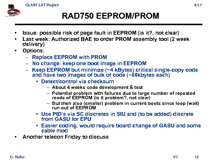 GLAST LAT Project 4. 1. 7 RAD 750 EEPROM/PROM • • • Issue: possible risk of page fault in EEPROM (is it? , not clear) Last week: Authorized BAE to order PROM assembly tool (2 week delivery) Options: – Replace EEPROM with PROM – No change: keep one boot image in EEPROM – Keep EEPROM but minimize (~4 k. Bytes) critical single-copy code and have two images of bulk of code (~60 kbytes each) • Detect/control via checksum – About 4 weeks code development & test – Potential problem with failures due to large number of repeated reads of EEPROM (is it problem? , not clear) – But then also (smaller) problem in current boots since loop (wait) run out of EEPROM • • Use PID’s via SC discretes in SIU and (to be added) discrete from GASU for EPU • Easier coding, would require board change of GASU and some cable mod Another telecon Friday to discuss G. Haller V 3 12