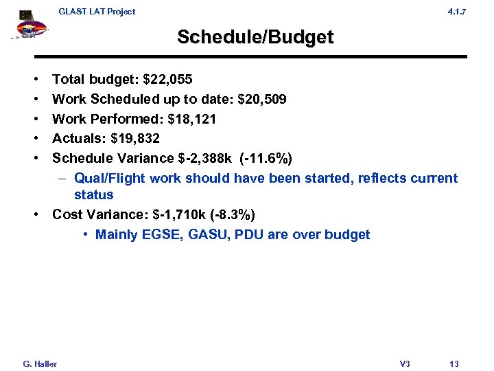 GLAST LAT Project 4. 1. 7 Schedule/Budget • • • Total budget: $22, 055 Work Scheduled up to date: $20, 509 Work Performed: $18, 121 Actuals: $19, 832 Schedule Variance $-2, 388 k (-11. 6%) – Qual/Flight work should have been started, reflects current status • Cost Variance: $-1, 710 k (-8. 3%) • Mainly EGSE, GASU, PDU are over budget G. Haller V 3 13