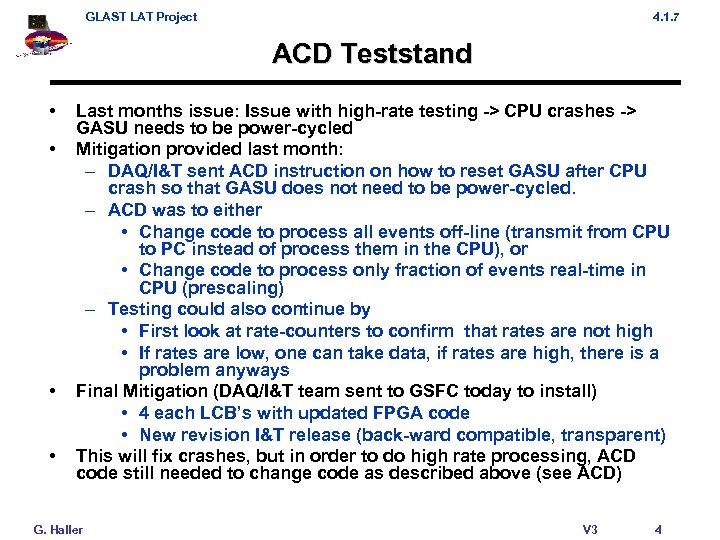 GLAST LAT Project 4. 1. 7 ACD Teststand • • Last months issue: Issue with high-rate testing -> CPU crashes -> GASU needs to be power-cycled Mitigation provided last month: – DAQ/I&T sent ACD instruction on how to reset GASU after CPU crash so that GASU does not need to be power-cycled. – ACD was to either • Change code to process all events off-line (transmit from CPU to PC instead of process them in the CPU), or • Change code to process only fraction of events real-time in CPU (prescaling) – Testing could also continue by • First look at rate-counters to confirm that rates are not high • If rates are low, one can take data, if rates are high, there is a problem anyways Final Mitigation (DAQ/I&T team sent to GSFC today to install) • 4 each LCB’s with updated FPGA code • New revision I&T release (back-ward compatible, transparent) This will fix crashes, but in order to do high rate processing, ACD code still needed to change code as described above (see ACD) G. Haller V 3 4