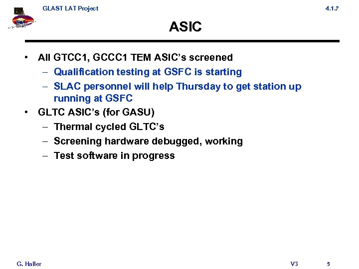 GLAST LAT Project 4. 1. 7 ASIC • All GTCC 1, GCCC 1 TEM ASIC’s screened – Qualification testing at GSFC is starting – SLAC personnel will help Thursday to get station up running at GSFC • GLTC ASIC’s (for GASU) – Thermal cycled GLTC’s – Screening hardware debugged, working – Test software in progress G. Haller V 3 5