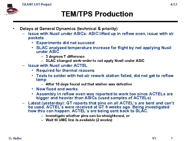 GLAST LAT Project 4. 1. 7 TEM/TPS Production • Delays at General Dynamics (technical & priority) – Issue with Nusil under ASICs: ASIC lifted up in reflow oven, issue with air pockets • Experiments did not succeed • SLAC analyzed temperature increase for flight by not applying Nusil under ASIC – 3 degrees T difference – SLAC changed work-order to not apply Nusil under ASIC – Issue with Nusil under ACTEL • Required for thermal reasons • Tests to solder with hot-air rework station failed, did not get to reflow temp – After 10 days found out that station was defective • Now fixed and works • Assembly in reflow oven was reported to work too since ACTELs are bigger and heavier than ASICs (used samples of ACTELs) – Latest (yesterday): GT reports that pins on all ACTEL’s are bent and can’t be used. ACTEL’s were received at GT 6 weeks ago. Being investigated how this can happen. ACTEL’s are being sent back to SLAC. – Investigate whether pins can be straightened, or – Wait til UMC line is available (2 weeks) G. Haller V 3 7