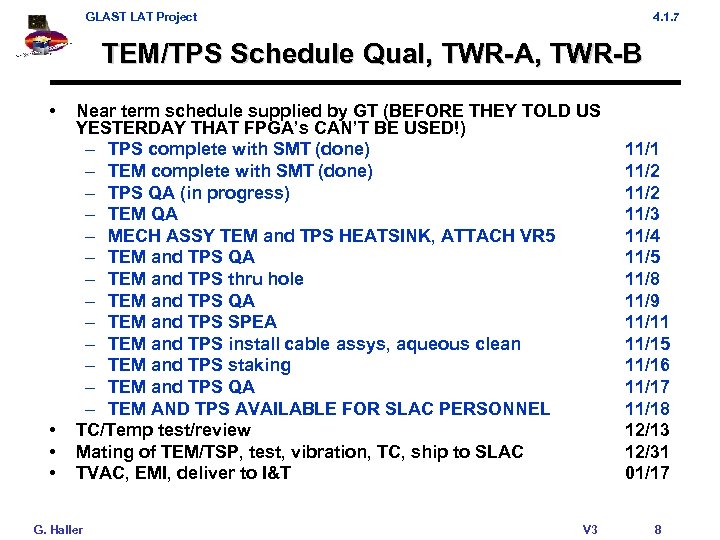 GLAST LAT Project 4. 1. 7 TEM/TPS Schedule Qual, TWR-A, TWR-B • • Near term schedule supplied by GT (BEFORE THEY TOLD US YESTERDAY THAT FPGA’s CAN’T BE USED!) – TPS complete with SMT (done) – TEM complete with SMT (done) – TPS QA (in progress) – TEM QA – MECH ASSY TEM and TPS HEATSINK, ATTACH VR 5 – TEM and TPS QA – TEM and TPS thru hole – TEM and TPS QA – TEM and TPS SPEA – TEM and TPS install cable assys, aqueous clean – TEM and TPS staking – TEM and TPS QA – TEM AND TPS AVAILABLE FOR SLAC PERSONNEL TC/Temp test/review Mating of TEM/TSP, test, vibration, TC, ship to SLAC TVAC, EMI, deliver to I&T G. Haller V 3 11/1 11/2 11/3 11/4 11/5 11/8 11/9 11/11 11/15 11/16 11/17 11/18 12/13 12/31 01/17 8