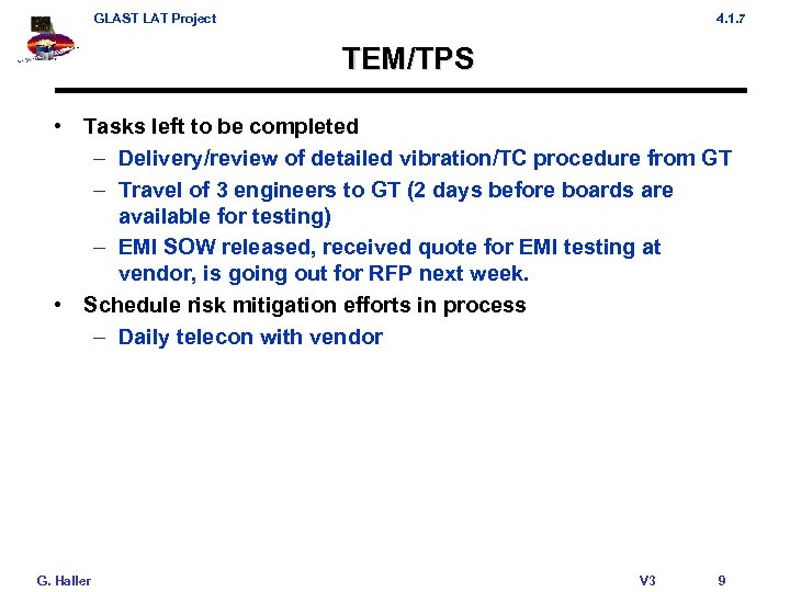 GLAST LAT Project 4. 1. 7 TEM/TPS • Tasks left to be completed – Delivery/review of detailed vibration/TC procedure from GT – Travel of 3 engineers to GT (2 days before boards are available for testing) – EMI SOW released, received quote for EMI testing at vendor, is going out for RFP next week. • Schedule risk mitigation efforts in process – Daily telecon with vendor G. Haller V 3 9