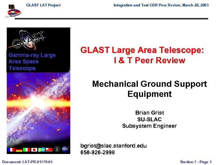 GLAST LAT Project Gamma-ray Large Area Space Telescope Integration and Test CDR Peer Review, March 28, 2003 GLAST Large Area Telescope: I & T Peer Review Mechanical Ground Support Equipment Brian Grist SU-SLAC Subsystem Engineer bgrist@slac. stanford. edu 650 -926 -2998 Document: LAT-PR-01779 -01 Section 7 - Page 1