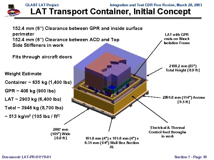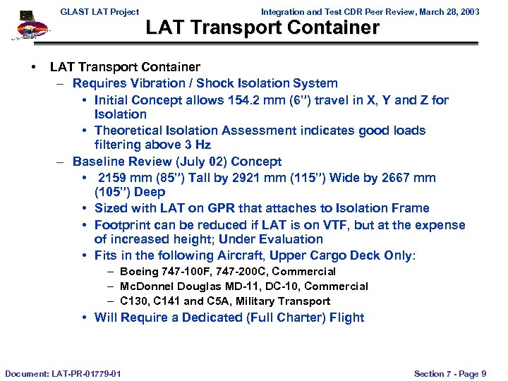 GLAST LAT Project • Integration and Test CDR Peer Review, March 28, 2003 LAT Transport Container – Requires Vibration / Shock Isolation System • Initial Concept allows 154. 2 mm (6”) travel in X, Y and Z for Isolation • Theoretical Isolation Assessment indicates good loads filtering above 3 Hz – Baseline Review (July 02) Concept • 2159 mm (85”) Tall by 2921 mm (115”) Wide by 2667 mm (105”) Deep • Sized with LAT on GPR that attaches to Isolation Frame • Footprint can be reduced if LAT is on VTF, but at the expense of increased height; Under Evaluation • Fits in the following Aircraft, Upper Cargo Deck Only: – Boeing 747 -100 F, 747 -200 C, Commercial – Mc. Donnel Douglas MD-11, DC-10, Commercial – C 130, C 141 and C 5 A, Military Transport • Will Require a Dedicated (Full Charter) Flight Document: LAT-PR-01779 -01 Section 7 - Page 9