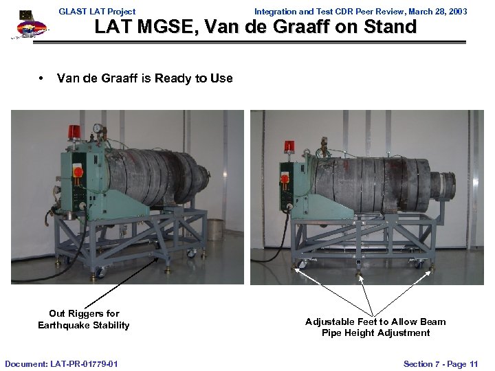 GLAST LAT Project Integration and Test CDR Peer Review, March 28, 2003 LAT MGSE, Van de Graaff on Stand • Van de Graaff is Ready to Use Out Riggers for Earthquake Stability Document: LAT-PR-01779 -01 Adjustable Feet to Allow Beam Pipe Height Adjustment Section 7 - Page 11