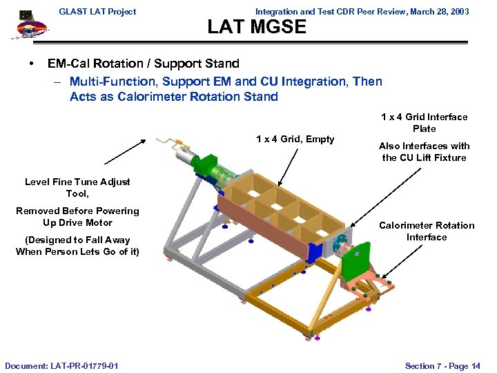 GLAST LAT Project Integration and Test CDR Peer Review, March 28, 2003 LAT MGSE, Calorimeter Lift Fixture • Available, Proof Tested and Ready to Use Lift Fixture Turnbuckles Allow Leveling Adjustment with 10 kg (22 lb) Alignment Tool Attached Alignment Tool Weight Reduced to about 4 kg (9. 0 lbs) Calorimeter Mass / Outermost Features Mock Up ~ 93 kg (205 lbs) EM-Single Grid Bay In Modification to Support EM Integration and Test Document: LAT-PR-01779 -01 Section 7 - Page 13