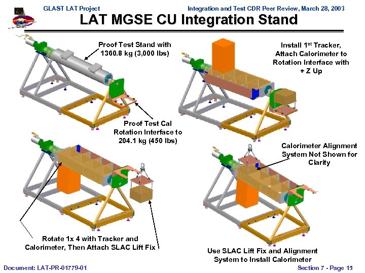 GLAST LAT Project Integration and Test CDR Peer Review, March 28, 2003 LAT MGSE CU Integration Stand Proof Test Stand with 1360. 8 kg (3, 000 lbs) Proof Test Cal Rotation Interface to 204. 1 kg (450 lbs) Rotate 1 x 4 with Tracker and Calorimeter, Then Attach SLAC Lift Fix Document: LAT-PR-01779 -01 Install 1 st Tracker, Attach Calorimeter to Rotation Interface with + Z Up Calorimeter Alignment System Not Shown for Clarity Use SLAC Lift Fix and Alignment System to Install Calorimeter Section 7 - Page 15