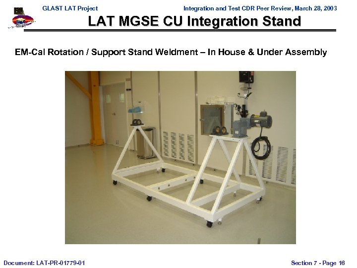 GLAST LAT Project Integration and Test CDR Peer Review, March 28, 2003 LAT MGSE CU Integration Stand EM-Cal Rotation / Support Stand Weldment – In House & Under Assembly Document: LAT-PR-01779 -01 Section 7 - Page 16