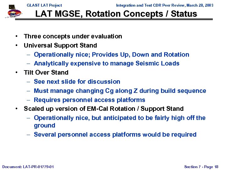 GLAST LAT Project Integration and Test CDR Peer Review, March 28, 2003 LAT MGSE, Rotation Concepts / Status • Three concepts under evaluation • Universal Support Stand – Operationally nice; Provides Up, Down and Rotation – Analytically expensive to manage Seismic Loads • Tilt Over Stand – See next slide for discussion – Must manage changing Cg along Z during build sequence – Requires personnel access platforms • Scaled up version of EM-Cal Rotation / Support Stand – Operationally nice, but anticipated to be fairly high off the ground – Several personnel access platforms would be required Document: LAT-PR-01779 -01 Section 7 - Page 18