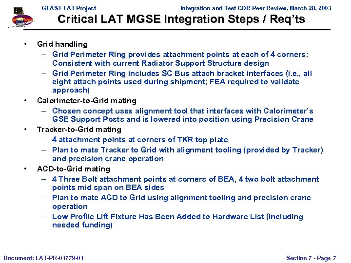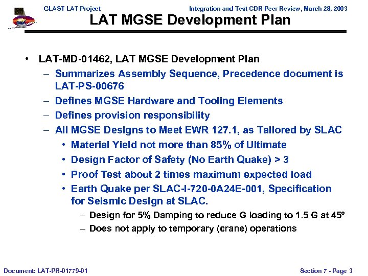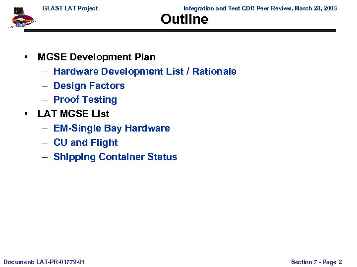 GLAST LAT Project Integration and Test CDR Peer Review, March 28, 2003 Outline • MGSE Development Plan – Hardware Development List / Rationale – Design Factors – Proof Testing • LAT MGSE List – EM-Single Bay Hardware – CU and Flight – Shipping Container Status Document: LAT-PR-01779 -01 Section 7 - Page 2