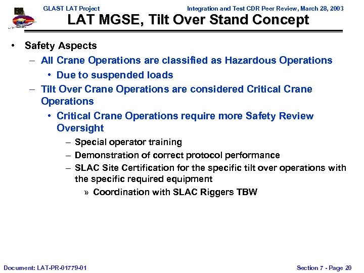 GLAST LAT Project Integration and Test CDR Peer Review, March 28, 2003 LAT MGSE, Tilt Over Stand Concept Document: LAT-PR-01779 -01 • Concerns and Mitigations – Tilt Over Shock as LAT passes 90º • Position GPR along average Cg Z (Study In Work) • Guide Ropes, Counter Balance Weights, Stop Brackets – Over Lift of LAT + Stands at High Point • Add load cell to Crane’s Lift Cable to provide feedback to operator – Available hook height can not support ACD Installation without special ACD Integration Stand Section 7 - Page 19