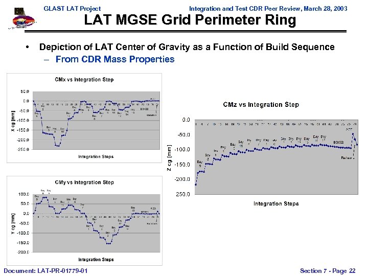 GLAST LAT Project Integration and Test CDR Peer Review, March 28, 2003 LAT MGSE Grid Perimeter Ring • Depiction of LAT Center of Gravity as a Function of Build Sequence – From CDR Mass Properties Document: LAT-PR-01779 -01 Section 7 - Page 22
