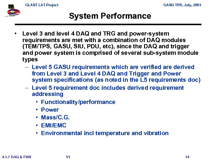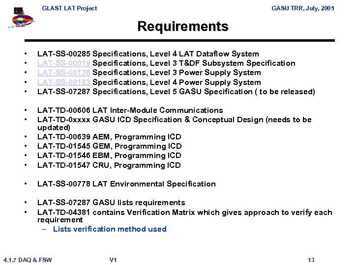 GLAST LAT Project GASU TRR, July, 2005 Requirements • • • LAT-SS-00285 Specifications, Level 4 LAT Dataflow System LAT-SS-00019 Specifications, Level 3 T&DF Subsystem Specification LAT-SS-00136 Specifications, Level 3 Power Supply System LAT-SS-00183 Specifications, Level 4 Power Supply System LAT-SS-07287 Specifications, Level 5 GASU Specification ( to be released) • • • LAT-TD-00606 LAT Inter-Module Communications LAT-TD-0 xxxx GASU ICD Specification & Conceptual Design (needs to be updated) LAT-TD-00639 AEM, Programming ICD LAT-TD-01545 GEM, Programming ICD LAT-TD-01546 EBM, Programming ICD LAT-TD-01547 CRU, Programming ICD • LAT-SS-00778 LAT Environmental Specification • • LAT-SS-07287 GASU lists requirements LAT-TD-04381 contains Verification Matrix which gives approach to verify each requirement – Lists verification method used 4. 1. 7 DAQ & FSW V 1 13