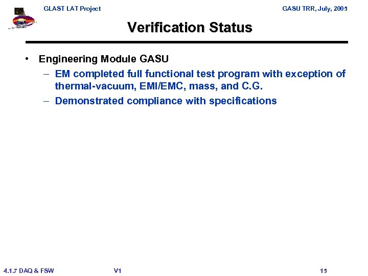 GLAST LAT Project GASU TRR, July, 2005 Verification Status • Engineering Module GASU – EM completed full functional test program with exception of thermal-vacuum, EMI/EMC, mass, and C. G. – Demonstrated compliance with specifications 4. 1. 7 DAQ & FSW V 1 15