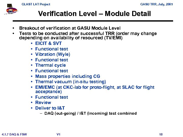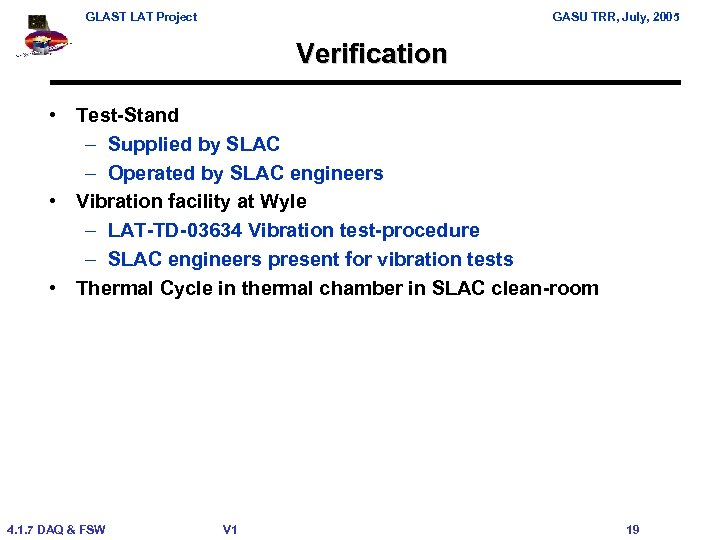 GLAST LAT Project GASU TRR, July, 2005 Verification Level – Module Detail • • Breakout of verification at GASU Module Level Tests to be conducted after successful TRR (order may change depending on availability of resourced (TV/EMI) • EICIT & SVT • Functional test • Vibration (Wyle) • Functional test • Thermal cycle • Functional test • Mass properties including CG • Thermal vacuum (in-situ testing) • EMI/EMC (at CKC-lab for proto-flight, at SLAC for flight acceptance) • Functional test • Review • Deliver to I&T – DAQ (out-going) / I&T (incoming) test combined 4. 1. 7 DAQ & FSW V 1 18