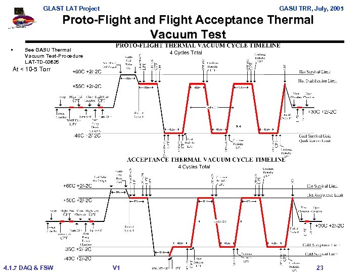 GLAST LAT Project GASU TRR, July, 2005 Thermal Vacuum Test • Thermal Vacuum facility in Building 33 at SLAC – Thermal Vacuum Chamber Operating Procedure LAT-TD 02541 – GASU Thermal Vacuum Test-Procedure LAT-TD-03635 (not released as of 9 -30 -05) – First GASU tested to proto-flight specifications (same Temperatures as qualification, but 4 TV cycles versus 12 cycles) 4. 1. 7 DAQ & FSW V 1 22
