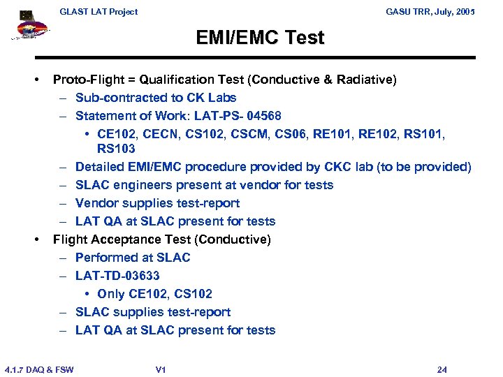 GLAST LAT Project GASU TRR, July, 2005 EMI/EMC Test • • Proto-Flight = Qualification Test (Conductive & Radiative) – Sub-contracted to CK Labs – Statement of Work: LAT-PS- 04568 • CE 102, CECN, CS 102, CSCM, CS 06, RE 101, RE 102, RS 101, RS 103 – Detailed EMI/EMC procedure provided by CKC lab (to be provided) – SLAC engineers present at vendor for tests – Vendor supplies test-report – LAT QA at SLAC present for tests Flight Acceptance Test (Conductive) – Performed at SLAC – LAT-TD-03633 • Only CE 102, CS 102 – SLAC supplies test-report – LAT QA at SLAC present for tests 4. 1. 7 DAQ & FSW V 1 24