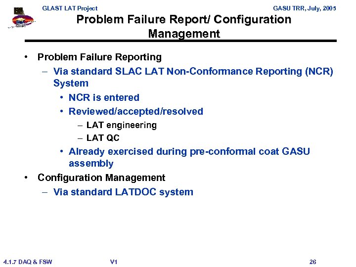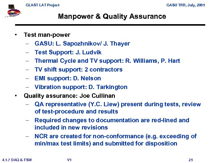 GLAST LAT Project GASU TRR, July, 2005 Manpower & Quality Assurance • • Test man-power – GASU: L. Sapozhnikov/ J. Thayer – Test Support: J. Ludvik – Thermal Cycle and TV support: R. Williams, P. Hart – TV shift support: 2 contractors – EMI support: D. Nelson – Vibration support: D. Tarkington Quality assurance: Joe Cullinan – QA representative (Y. C. Liew) present during tests, review of test-procedure and results – Required changes to documentation are red-lined and included in new revisions – NCR are created for non-conformance (e. g. exceeding of min/max test limits) and submitted for disposition 4. 1. 7 DAQ & FSW V 1 25