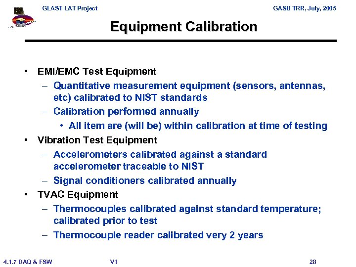 GLAST LAT Project GASU TRR, July, 2005 Equipment Calibration • EMI/EMC Test Equipment – Quantitative measurement equipment (sensors, antennas, etc) calibrated to NIST standards – Calibration performed annually • All item are (will be) within calibration at time of testing • Vibration Test Equipment – Accelerometers calibrated against a standard accelerometer traceable to NIST – Signal conditioners calibrated annually • TVAC Equipment – Thermocouples calibrated against standard temperature; calibrated prior to test – Thermocouple reader calibrated very 2 years 4. 1. 7 DAQ & FSW V 1 28