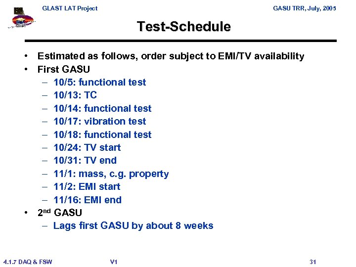 GLAST LAT Project GASU TRR, July, 2005 Risk Assessment • Schedule – Pressure to deliver flight hardware could force less than complete characterization and analysis of modules, could result in replicating a problem in the second module • Performance – None known 4. 1. 7 DAQ & FSW V 1 30