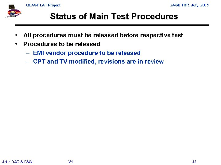 GLAST LAT Project GASU TRR, July, 2005 Status of Main Test Procedures • All procedures must be released before respective test • Procedures to be released – EMI vendor procedure to be released – CPT and TV modified, revisions are in review 4. 1. 7 DAQ & FSW V 1 32
