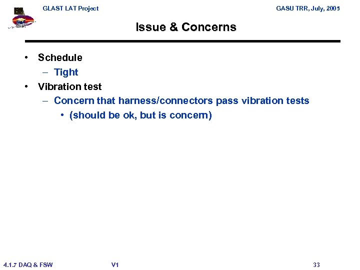 GLAST LAT Project GASU TRR, July, 2005 Issue & Concerns • Schedule – Tight • Vibration test – Concern that harness/connectors pass vibration tests • (should be ok, but is concern) 4. 1. 7 DAQ & FSW V 1 33