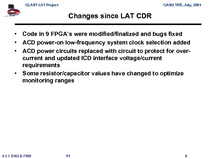 GLAST LAT Project GASU TRR, July, 2005 Changes since LAT CDR • Code in 9 FPGA’s were modified/finalized and bugs fixed • ACD power-on low-frequency system clock selection added • ACD power circuits replaced with circuit to protect for overcurrent and updated ICD interface voltage/current requirements • Some resistor/capacitor values have changed to optimize monitoring ranges 4. 1. 7 DAQ & FSW V 1 8
