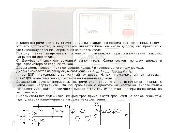 В таком выпрямителе отсутствует подмагничивание трансформатора постоянным током – это его достоинство, а недостатком является большое число диодов, что приводит к увеличенному падению напряжения на выпрямителе. Поэтому такие выпрямители основном применяются при выпрямлении высоких напряжений (более 5 В). б) Двухфазный двухполупериодный выпрямитель. Схема состоит из двух диодов и трансформатора со средней точкой. Диоды схемы проводят ток поочередно, каждый в течение одного полупериода. Диоды выбирается из следующих соотношений: , где I ДОП – максимально допустимый ток диода, I Н. max – максимальный ток нагрузки, U ОБР. ДОП – максимально допустимое напряжение на диоде. Двухфазный двухполупериодный выпрямитель применяется в источниках питания с небольшим напряжениям. Он по сравнению с однофазным мостовым выпрямителем позволяет уменьшить вдвое число диодов и тем самым понизить потери напряжения на выпрямителе. Выпрямители без сглаживающих фильтров применяются сравнительно редко, лишь там, где пульсации напряжения на нагрузке не существенны. ДОПн. IImax. m. ДОПОБРUU 1.